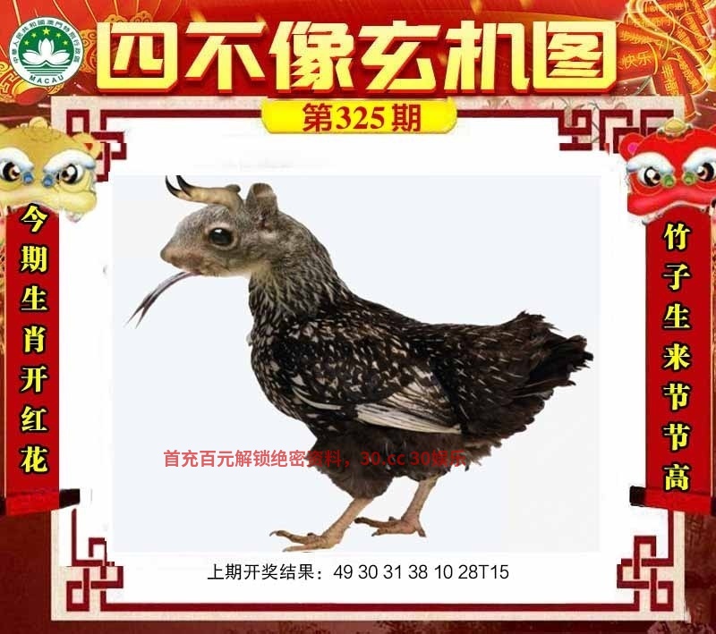 325期四不像玄机解:图中物鼠头,鸡身 综合九肖:鼠鸡马兔虎羊龙猪狗 六肖中特:鼠鸡马兔虎羊 |